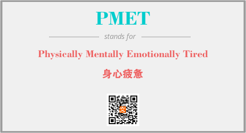 英文缩略词“PMET”经常作为“Physically Mentally Emotionally Tired”的英文缩写来使用,中文表示:“身心疲惫”。本文将详细介绍英文缩写词PMET所代表英文单词,其对应的中文拼音、详细解释以及在英语中的流行度。此外,还有关于缩略词PMET的分类、应用领域及相关应用示例等。