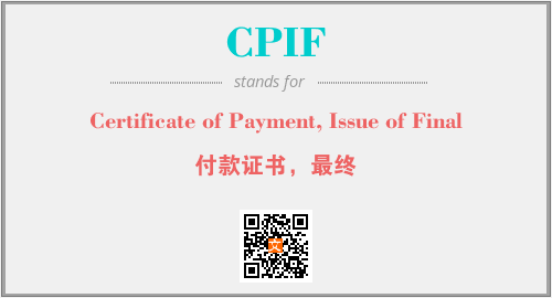 英文缩略词“CPIF”经常作为“Certificate of Payment, Issue of Final”的英文缩写来使用,中文表示:“付款证书,最终”。本文将详细介绍英文缩写词CPIF所代表英文单词,其对应的中文拼音、详细解释以及在英语中的流行度。此外,还有关于缩略词CPIF的分类、应用领域及相关应用示例等。
