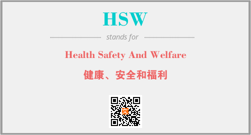 英文缩略词“HSW”经常作为“Health Safety And Welfare”的英文缩写来使用,中文表示:“健康、安全和福利”。本文将详细介绍英文缩写词HSW所代表英文单词,其对应的中文拼音、详细解释以及在英语中的流行度。此外,还有关于缩略词HSW的分类、应用领域及相关应用示例等。