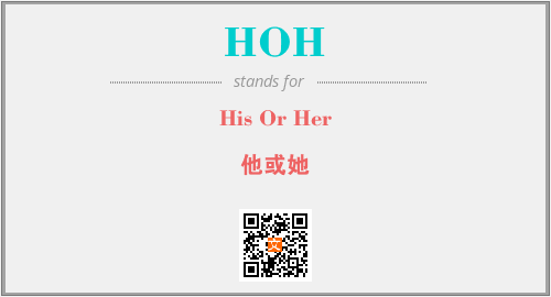 上述内容是“His Or Her”作为“HOH”的缩写,解释为“他或她”时的信息,以及英文缩略词HOH所代表的英文单词,其对应的中文拼音、详细解释以及在英文中的流行度和相关分类、应用领域及应用示例等。