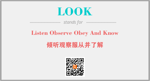 上述内容是“Listen Observe Obey And Know”作为“LOOK”的缩写,解释为“倾听观察服从并了解”时的信息,以及英文缩略词LOOK所代表的英文单词,其对应的中文拼音、详细解释以及在英文中的流行度和相关分类、应用领域及应用示例等。