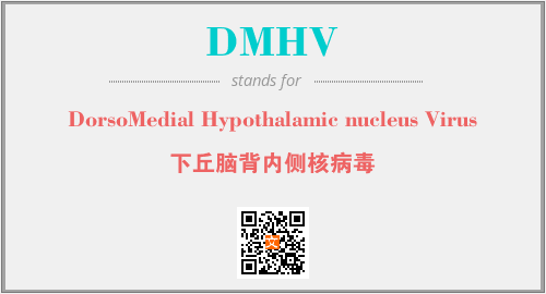 上述内容是“DorsoMedial Hypothalamic nucleus Virus”作为“DMHV”的缩写,解释为“下丘脑背内侧核病毒”时的信息,以及英文缩略词DMHV所代表的英文单词,其对应的中文拼音、详细解释以及在英文中的流行度和相关分类、应用领域及应用示例等。