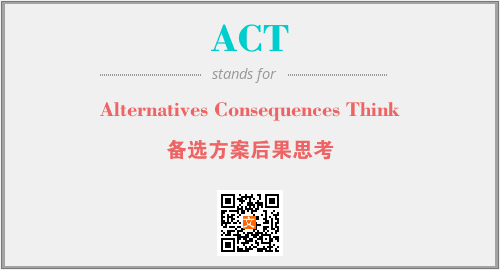 上述内容是“Alternatives Consequences Think”作为“ACT”的缩写,解释为“备选方案后果思考”时的信息,以及英文缩略词ACT所代表的英文单词,其对应的中文拼音、详细解释以及在英文中的流行度和相关分类、应用领域及应用示例等。