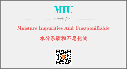 上述内容是“Moisture Impurities And Unsaponifiable”作为“MIU”的缩写,解释为“水分杂质和不皂化物”时的信息,以及英文缩略词MIU所代表的英文单词,其对应的中文拼音、详细解释以及在英文中的流行度和相关分类、应用领域及应用示例等。