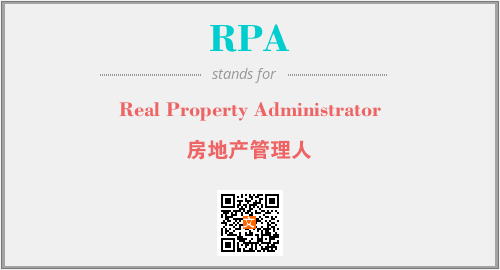 上述内容是“Real Property Administrator”作为“RPA”的缩写,解释为“房地产管理人”时的信息,以及英文缩略词RPA所代表的英文单词,其对应的中文拼音、详细解释以及在英文中的流行度和相关分类、应用领域及应用示例等。