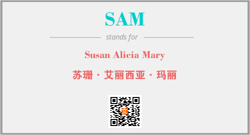 上述内容是“Susan Alicia Mary”作为“SAM”的缩写,解释为“苏珊·艾丽西亚·玛丽”时的信息,以及英文缩略词SAM所代表的英文单词,其对应的中文拼音、详细解释以及在英文中的流行度和相关分类、应用领域及应用示例等。