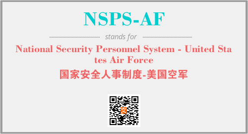 英文缩略词“NSPS-AF”经常作为“National Security Personnel System - United States Air Force”的英文缩写来使用,中文表示:“国家安全人事制度-美国空军”。本文将详细介绍英文缩写词NSPS-AF所代表英文单词,其对应的中文拼音、详细解释以及在英语中的流行度。此外,还有关于缩略词NSPS-AF的分类、应用领域及相关应用示例等。