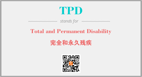上述内容是“Total and Permanent Disability”作为“TPD”的缩写,解释为“完全和永久残疾”时的信息,以及英文缩略词TPD所代表的英文单词,其对应的中文拼音、详细解释以及在英文中的流行度和相关分类、应用领域及应用示例等。