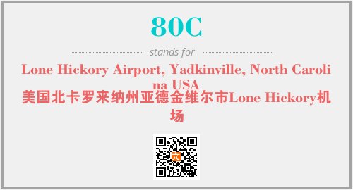 上述内容是“Lone Hickory Airport, Yadkinville, North Carolina USA”作为“80C”的缩写,解释为“美国北卡罗来纳州亚德金维尔市Lone Hickory机场”时的信息,以及英文缩略词80C所代表的英文单词,其对应的中文拼音、详细解释以及在英文中的流行度和相关分类、应用领域及应用示例等。