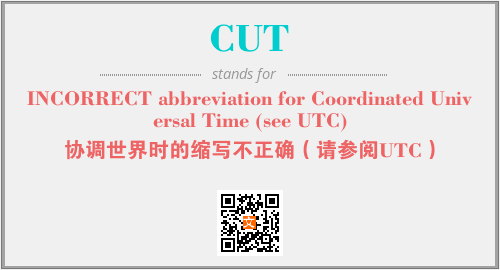 上述内容是“INCORRECT abbreviation for Coordinated Universal Time (see UTC)”作为“CUT”的缩写,解释为“协调世界时的缩写不正确(请参阅UTC)”时的信息,以及英文缩略词CUT所代表的英文单词,其对应的中文拼音、详细解释以及在英文中的流行度和相关分类、应用领域及应用示例等。