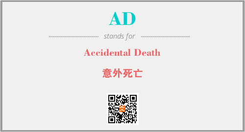 上述内容是“Accidental Death”作为“AD”的缩写,解释为“意外死亡”时的信息,以及英文缩略词AD所代表的英文单词,其对应的中文拼音、详细解释以及在英文中的流行度和相关分类、应用领域及应用示例等。