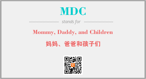 英文缩略词“MDC”经常作为“Mommy, Daddy, and Children”的英文缩写来使用,中文表示:“妈妈、爸爸和孩子们”。本文将详细介绍英文缩写词MDC所代表英文单词,其对应的中文拼音、详细解释以及在英语中的流行度。此外,还有关于缩略词MDC的分类、应用领域及相关应用示例等。