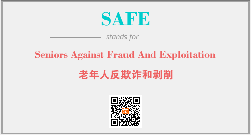 上述内容是“Seniors Against Fraud And Exploitation”作为“SAFE”的缩写,解释为“老年人反欺诈和剥削”时的信息,以及英文缩略词SAFE所代表的英文单词,其对应的中文拼音、详细解释以及在英文中的流行度和相关分类、应用领域及应用示例等。