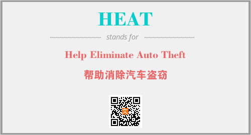 上述内容是“Help Eliminate Auto Theft”作为“HEAT”的缩写,解释为“帮助消除汽车盗窃”时的信息,以及英文缩略词HEAT所代表的英文单词,其对应的中文拼音、详细解释以及在英文中的流行度和相关分类、应用领域及应用示例等。