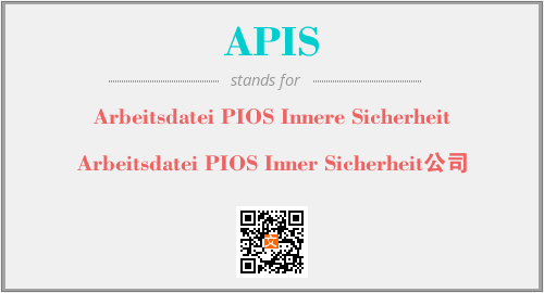 上述内容是“Arbeitsdatei PIOS Innere Sicherheit”作为“APIS”的缩写,解释为“Arbeitsdatei PIOS Inner Sicherheit公司”时的信息,以及英文缩略词APIS所代表的英文单词,其对应的中文拼音、详细解释以及在英文中的流行度和相关分类、应用领域及应用示例等。