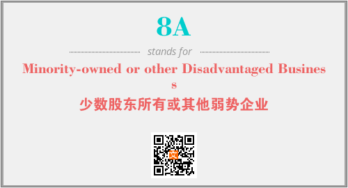 上述内容是“Minority-owned or other Disadvantaged Business”作为“8A”的缩写,解释为“少数股东所有或其他弱势企业”时的信息,以及英文缩略词8A所代表的英文单词,其对应的中文拼音、详细解释以及在英文中的流行度和相关分类、应用领域及应用示例等。