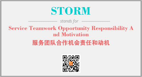 上述内容是“Service Teamwork Opportunity Responsibility And Motivation”作为“STORM”的缩写,解释为“服务团队合作机会责任和动机”时的信息,以及英文缩略词STORM所代表的英文单词,其对应的中文拼音、详细解释以及在英文中的流行度和相关分类、应用领域及应用示例等。