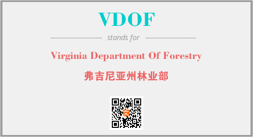 上述内容是“Virginia Department Of Forestry”作为“VDOF”的缩写,解释为“弗吉尼亚州林业部”时的信息,以及英文缩略词VDOF所代表的英文单词,其对应的中文拼音、详细解释以及在英文中的流行度和相关分类、应用领域及应用示例等。