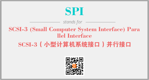 上述内容是“SCSI-3 (Small Computer System Interface) Parallel Interface”作为“SPI”的缩写,解释为“SCSI-3(小型计算机系统接口)并行接口”时的信息,以及英文缩略词SPI所代表的英文单词,其对应的中文拼音、详细解释以及在英文中的流行度和相关分类、应用领域及应用示例等。