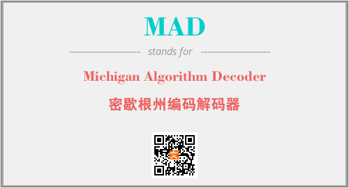 上述内容是“Michigan Algorithm Decoder”作为“MAD”的缩写,解释为“密歇根州编码解码器”时的信息,以及英文缩略词MAD所代表的英文单词,其对应的中文拼音、详细解释以及在英文中的流行度和相关分类、应用领域及应用示例等。