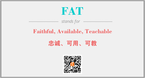 上述内容是“Faithful, Available, Teachable”作为“FAT”的缩写,解释为“忠诚、可用、可教”时的信息,以及英文缩略词FAT所代表的英文单词,其对应的中文拼音、详细解释以及在英文中的流行度和相关分类、应用领域及应用示例等。