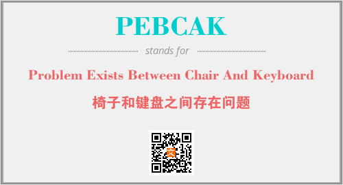 英文缩略词“PEBCAK”经常作为“Problem Exists Between Chair And Keyboard”的英文缩写来使用,中文表示:“椅子和键盘之间存在问题”。本文将详细介绍英文缩写词PEBCAK所代表英文单词,其对应的中文拼音、详细解释以及在英语中的流行度。此外,还有关于缩略词PEBCAK的分类、应用领域及相关应用示例等。