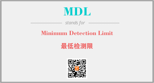 上述内容是“Minimum Detection Limit”作为“MDL”的缩写,解释为“最低检测限”时的信息,以及英文缩略词MDL所代表的英文单词,其对应的中文拼音、详细解释以及在英文中的流行度和相关分类、应用领域及应用示例等。