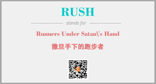 上述内容是“Runners Under Satan\'s Hand”作为“RUSH”的缩写,解释为“撒旦手下的跑步者”时的信息,以及英文缩略词RUSH所代表的英文单词,其对应的中文拼音、详细解释以及在英文中的流行度和相关分类、应用领域及应用示例等。