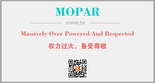 英文缩略词“MOPAR”经常作为“Massively Over Powered And Respected”的英文缩写来使用,中文表示:“权力过大,备受尊敬”。本文将详细介绍英文缩写词MOPAR所代表英文单词,其对应的中文拼音、详细解释以及在英语中的流行度。此外,还有关于缩略词MOPAR的分类、应用领域及相关应用示例等。