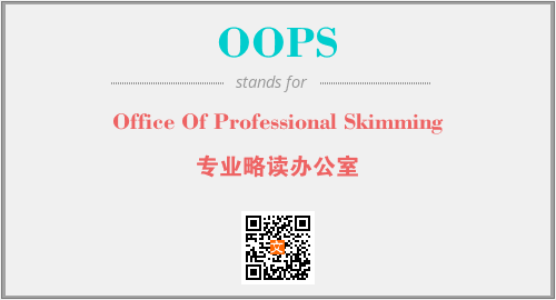 英文缩略词“OOPS”经常作为“Office Of Professional Skimming”的英文缩写来使用,中文表示:“专业略读办公室”。本文将详细介绍英文缩写词OOPS所代表英文单词,其对应的中文拼音、详细解释以及在英语中的流行度。此外,还有关于缩略词OOPS的分类、应用领域及相关应用示例等。