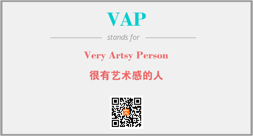 上述内容是“Very Artsy Person”作为“VAP”的缩写,解释为“很有艺术感的人”时的信息,以及英文缩略词VAP所代表的英文单词,其对应的中文拼音、详细解释以及在英文中的流行度和相关分类、应用领域及应用示例等。