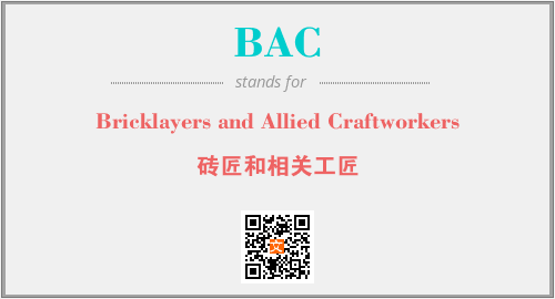 上述内容是“Bricklayers and Allied Craftworkers”作为“BAC”的缩写,解释为“砖匠和相关工匠”时的信息,以及英文缩略词BAC所代表的英文单词,其对应的中文拼音、详细解释以及在英文中的流行度和相关分类、应用领域及应用示例等。