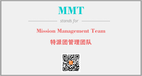英文缩略词“MMT”经常作为“Mission Management Team”的英文缩写来使用,中文表示:“特派团管理团队”。本文将详细介绍英文缩写词MMT所代表英文单词,其对应的中文拼音、详细解释以及在英语中的流行度。此外,还有关于缩略词MMT的分类、应用领域及相关应用示例等。