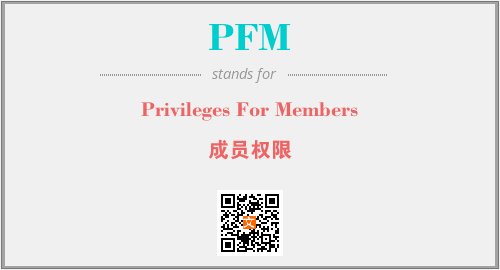 英文缩略词“PFM”经常作为“Privileges For Members”的英文缩写来使用,中文表示:“成员权限”。本文将详细介绍英文缩写词PFM所代表英文单词,其对应的中文拼音、详细解释以及在英语中的流行度。此外,还有关于缩略词PFM的分类、应用领域及相关应用示例等。
