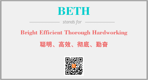 上述内容是“Bright Efficient Thorough Hardworking”作为“BETH”的缩写,解释为“聪明、高效、彻底、勤奋”时的信息,以及英文缩略词BETH所代表的英文单词,其对应的中文拼音、详细解释以及在英文中的流行度和相关分类、应用领域及应用示例等。