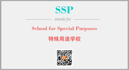 英文缩略词“SSP”经常作为“School for Special Purposes”的英文缩写来使用,中文表示:“特殊用途学校”。本文将详细介绍英文缩写词SSP所代表英文单词,其对应的中文拼音、详细解释以及在英语中的流行度。此外,还有关于缩略词SSP的分类、应用领域及相关应用示例等。