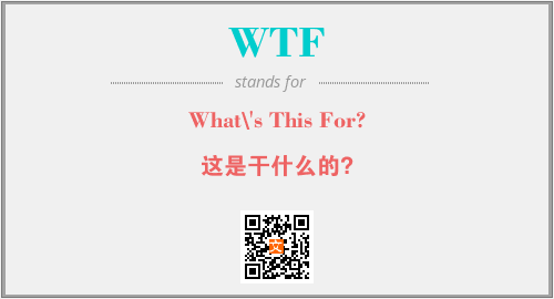 上述内容是“What\'s This For?”作为“WTF”的缩写,解释为“这是干什么的?”时的信息,以及英文缩略词WTF所代表的英文单词,其对应的中文拼音、详细解释以及在英文中的流行度和相关分类、应用领域及应用示例等。