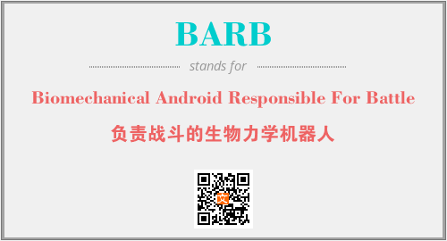 英文缩略词“BARB”经常作为“Biomechanical Android Responsible For Battle”的英文缩写来使用,中文表示:“负责战斗的生物力学机器人”。本文将详细介绍英文缩写词BARB所代表英文单词,其对应的中文拼音、详细解释以及在英语中的流行度。此外,还有关于缩略词BARB的分类、应用领域及相关应用示例等。