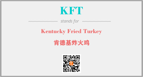 上述内容是“Kentucky Fried Turkey”作为“KFT”的缩写,解释为“肯德基炸火鸡”时的信息,以及英文缩略词KFT所代表的英文单词,其对应的中文拼音、详细解释以及在英文中的流行度和相关分类、应用领域及应用示例等。