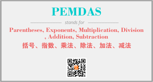英文缩略词“PEMDAS”经常作为“Parentheses, Exponents, Multiplication, Division, Addition, Subtraction”的英文缩写来使用,中文表示:“括号、指数、乘法、除法、加法、减法”。本文将详细介绍英文缩写词PEMDAS所代表英文单词,其对应的中文拼音、详细解释以及在英语中的流行度。此外,还有关于缩略词PEMDAS的分类、应用领域及相关应用示例等。