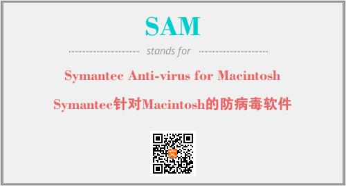 上述内容是“Symantec Anti-virus for Macintosh”作为“SAM”的缩写,解释为“Symantec针对Macintosh的防病毒软件”时的信息,以及英文缩略词SAM所代表的英文单词,其对应的中文拼音、详细解释以及在英文中的流行度和相关分类、应用领域及应用示例等。