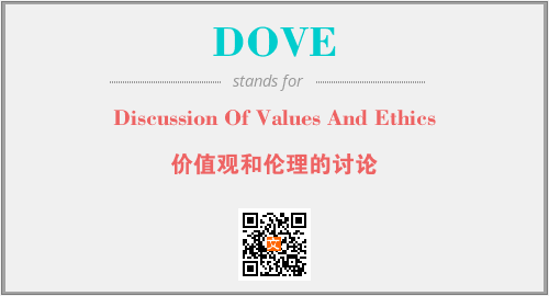 上述内容是“Discussion Of Values And Ethics”作为“DOVE”的缩写,解释为“价值观和伦理的讨论”时的信息,以及英文缩略词DOVE所代表的英文单词,其对应的中文拼音、详细解释以及在英文中的流行度和相关分类、应用领域及应用示例等。