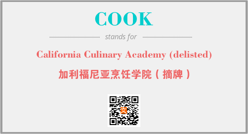 上述内容是“California Culinary Academy (delisted)”作为“COOK”的缩写,解释为“加利福尼亚烹饪学院(摘牌)”时的信息,以及英文缩略词COOK所代表的英文单词,其对应的中文拼音、详细解释以及在英文中的流行度和相关分类、应用领域及应用示例等。
