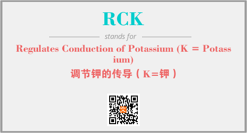 上述内容是“Regulates Conduction of Potassium (K = Potassium)”作为“RCK”的缩写,解释为“调节钾的传导(K=钾)”时的信息,以及英文缩略词RCK所代表的英文单词,其对应的中文拼音、详细解释以及在英文中的流行度和相关分类、应用领域及应用示例等。