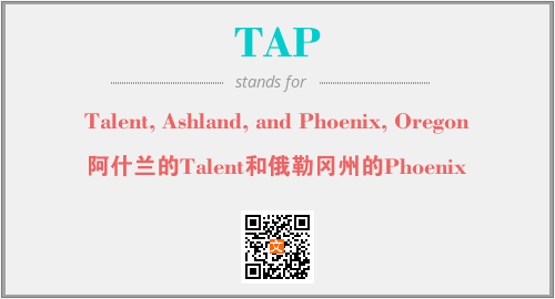 上述内容是“Talent, Ashland, and Phoenix, Oregon”作为“TAP”的缩写,解释为“阿什兰的Talent和俄勒冈州的Phoenix”时的信息,以及英文缩略词TAP所代表的英文单词,其对应的中文拼音、详细解释以及在英文中的流行度和相关分类、应用领域及应用示例等。