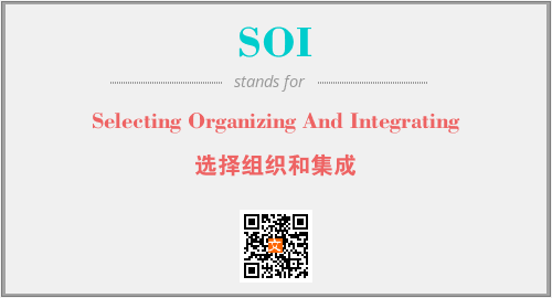 上述内容是“Selecting Organizing And Integrating”作为“SOI”的缩写,解释为“选择组织和集成”时的信息,以及英文缩略词SOI所代表的英文单词,其对应的中文拼音、详细解释以及在英文中的流行度和相关分类、应用领域及应用示例等。