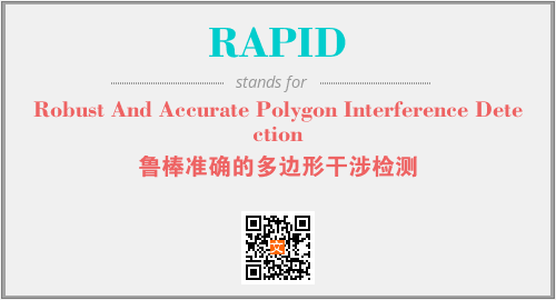 上述内容是“Robust And Accurate Polygon Interference Detection”作为“RAPID”的缩写,解释为“鲁棒准确的多边形干涉检测”时的信息,以及英文缩略词RAPID所代表的英文单词,其对应的中文拼音、详细解释以及在英文中的流行度和相关分类、应用领域及应用示例等。