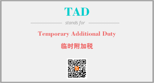 上述内容是“Temporary Additional Duty”作为“TAD”的缩写,解释为“临时附加税”时的信息,以及英文缩略词TAD所代表的英文单词,其对应的中文拼音、详细解释以及在英文中的流行度和相关分类、应用领域及应用示例等。