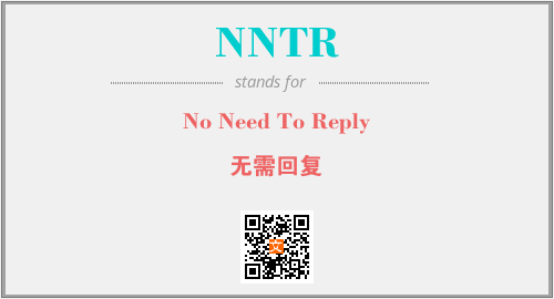 上述内容是“No Need To Reply”作为“NNTR”的缩写,解释为“无需回复”时的信息,以及英文缩略词NNTR所代表的英文单词,其对应的中文拼音、详细解释以及在英文中的流行度和相关分类、应用领域及应用示例等。