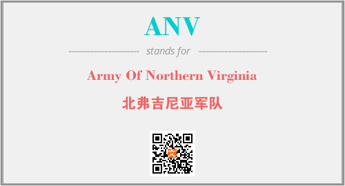 上述内容是“Army Of Northern Virginia”作为“ANV”的缩写,解释为“北弗吉尼亚军队”时的信息,以及英文缩略词ANV所代表的英文单词,其对应的中文拼音、详细解释以及在英文中的流行度和相关分类、应用领域及应用示例等。